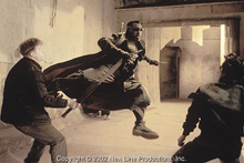 Beweisstück eins: Das Drehbuch. Verfasst von David Goyer, der sowohl für den gelungenen Erstling verantwortlich ist (ein Versehen?), als auch am genialischen "Dark City" mitschrieb. Allerdings auch alleinverantwortlich ist für "The Crow - City of Angels". Was dann zwar die vielen Parallelen erklärt bis hin zu einer lachhaften und wahrlich traurigen Selbstkopie in der Schlussszene (ist der Mann von Peepshowboxen besessen, oder was?), aber auch beweist, dass man hier auf den völlig falschen Mann zurückgegriffen hat. Während Goyers Vorliebe für Gothic - für ihn offenbar synonym von S/M Look, Leder en masse und möglichst viel Perversität und grotesken Bildern - bei z.B. "Dark City" offensichtlich von den Co-Autoren in Schach gehalten wurde, hat er hier freie Bahn, und es zeigt sich. Seine Geschichte, um eine Allianz zwischen Blade und der Vampirgemeinde zwecks Bekämpfung eines wesentlich schlimmeren gemeinsamen Feindes, ist in der Konzeption schon ein alter Hut, in ihrer Ausführung noch weitaus dürftiger. Da wird Blade nach Rettung seines alten Mentors und Waffenschmieds Whistler (Kris Kristofferson) mit dem "Bloodpack" zusammengeworfen, als Spezialkampftruppe quasi die GSG-9 der Vampire, und bekommt dann mit dessen Mitglied Nyssa, gleichzeitig auch Tochter von Vampirobermotz Damaskinos, zwecks größerem dramatischen Effekt auch noch ein love interest auf den muskulösen Leib geschrieben. Natürlich hat Blade dann auch erstmal derbe Probleme mit seiner neuen Crew und ihrem erstmaligen Anführer Rheinhart (Ron Perlman), bevor er sich dann auf die Jagd nach den "reapers" machen kann. Angeführt von Nomak (Luke Goss),sind die "reapers" so eine Art Übervampire, die sowohl Menschen als auch Vampire gleichermaßen in ihren Speiseplan aufnehmen. Die üblichen absehbaren Konflikte innerhalb der Gruppe folgen, direkt danach dann ein paar lächerliche plot twists, die aber in ihrer Simplizität und Vorhersehbarkeit erstens nur Gähnen auslösen und zweitens zu einem Zeitpunkt kommen, an dem man diesen hoffnungslosen Film schon lange aufgegeben hat.