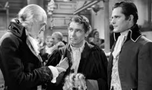 Dickens Werk ist ja dafür bekannt etwas “durcheinander“ geschrieben zu sein – einige Puzzleteile fügen sich erst relativ spät ineinander. Das will man dem Publikum hier aber nicht antun und geht in Sachen Drehbuch relativ geradlinig vor. Kurz vor der französischen Revolution erfährt die in England lebende Lucie (Elizabeth Allan, “David Copperfield“), dass ihr Vater (Henry B. Walthall) entgegen ihrem Wissen noch am Leben ist. Sie macht sich direkt auf nach Paris, wo der rücksichtslose Marquis St. Evremonde (Basil Rathbone, “Unter Piratenflagge“) ihren Vater 18 Jahre lang unschuldig im Gefängnis hatte schmoren lassen. Nach dem emotionalen Treffen lernt sie auf ihrem Rückweg nach London dann den jungen Charles Darnay (Donald Woods, “Louis Pasteur“) kennen, ohne allerdings dessen wahre Identität zu erahnen. Darnay ist nämlich der deutlich angenehmer geratene Neffe des Marquis und hat sich mit seinem humanistischen Gedankengut gar den Zorn des mächtigen Onkels zugezogen. Kein Feind, den man unbedingt haben möchte und so wird Darnay schon bald Opfer eines hinterlistigen Komplotts, das ihn in London auf die Anklagebank bringt. Ausgerechnet der vor allem für seinen Alkoholkonsum bekannte Anwalt Sydney Carton (Ronald Colman, “Arrowsmith“) soll Darnay verteidigen, doch das ist schon fast ein Kinderspiel angesichts der Irren und Wirrungen der französischen Revolution, die bald alle Protagonisten zum Spielball der Geschichte werden lassen.