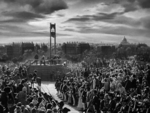 Zumindest am Anfang ist die “kurze“ Laufzeit des Filmes auch ein Problem für den Erzählrhythmus, denn da macht man es sich mit dem Überspringen von wichtigen Ereignissen schon sehr einfach (und nutzt dafür zum Beispiel Texttafeln – ein in dieser Reihe bereits schon öfters beobachtetes Relikt aus der Stummfilmzeit). Im weitere Verlauf wird das Handlungstempo aber glücklicherweise etwas geschmeidiger und es gesellen sich dann auch noch ein paar wirklich schöne Schauplätze hinzu. Gerade die Erstürmung der Bastille ist für die damalige Zeit wirklich beeindruckend geraten und auch heute noch ein kleiner Hingucker. Das ist dann auch gerade das schöne an dieser Inszenierung – man kann hier eben sowohl Spektakel als auch ruhige Momente. Wen man dafür nun loben soll ist gar nicht so leicht, denn Regisseur Jack Conway war mehrere Wochen krank (das war ihm schon bei "Schrei der Gehetzten" passiert) und wurde bis zu seiner Rückkehr von Robert Z. Leonard ("The Divorcee", "Tolle Marietta") ersetzt – was man dem Film aber nicht anmerkt.