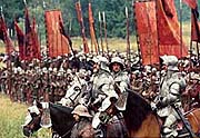 Luc Besson wäre nicht Luc Besson, würde er diesen Stoff nicht absolut bildgewaltig inszenieren: Tatsächlich ist "Johanna von Orleans" sehr progressiv gemacht, und die Kombination der Schwert- und Schlösserschwarte mit psychedelischen Filmtechniken ist reizvoll. Und tatsächlich gab sich der Franzose größte Mühe, die Story möglichst vielschichtig umzusetzen. Aber das ist die weitere große Schwäche des Films: Besson will einfach zuviel. "Braveheart"-Geknüppel, theo- und psychologisches Lehrstück, Historie, Biographie, Kunstfilm - das sind definitiv ein paar Wünsche zuviel. Und leider verzichtet Besson auf dezente Töne, so daß jede Seite ins Maßlose abdriftet. Wer zum Beispiel beim Blut auf der Linse von  "Braveheart" oder "The Bruce" mit Grausen sein Popcorn wiederkäuen mußte, wird hier keine Freude haben: Abgetrennte Gliedmaßen tanzen Rock ´n Roll. Und doch bleibt keine Zeit für den rechten Durchblick in die Kriegskunst, denn - ups - da hat Jeanne auch schon wieder eine neuerliche Erscheinung, mit viel Farbfilter und Zeitraffer. Der Zuschauer windet sich entnervt im Kinosessel - Schmalz trieft von den Wänden.