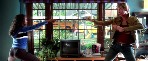 Eine der großen Besonderheiten an den Action-Szenen von Kill Bill ist für mich die Art der Auflösung in Kombination mit dem meisterhaften Schnitt der leider viel zu früh verstorbenen Sally Menke. Während heutige Action-Sequenzen häufig den John Wick-Weg gehen und versuchen, in möglichst langen, ununterbrochenen Einstellungen die Physis der Performer und die Choreografie am Stück zu zeigen, zollen die Kill Bill-Fights der Tatsache Tribut, dass Uma Thurman, Darryl Hannah und Co. keine gelernten Martial-Artists sind, und sind sehr stark in viele kleine Einzelteile fragmentiert. Allerdings nicht auf effektheischende und Schwächen kompensierende Art wie z. B. eine beliebige Liam-Neeson-Auseinandersetzung, sondern so, dass jeder einzelne move in der klarst-möglichen Einstellung eingefangen ist und mit maximalem Impact rhythmisch zur nächsten Einstellung führt. Die Braut fliegt z.B. von rechts nach links mit großer Übersicht einmal durchs komplette Bild, bevor der nächste Shot ihren Aufprall von oben zeigt; eine lange Ausholbewegung des Nagelbretts mit befestigter Sam-Raimi-Kamera führt zu einer Nahaufnahme der Bride-Reaktion beim Kontakt, bevor im nächsten Bild Go-Gos City of the Living Dead Blutaugen offenbart werden. Jede einzelne Einstellung ist dabei ausnahmslos mit maximalem Fokus auf Präzision, Schönheit und Klarheit von Kameramann Robert Richardson sorgfältig komponiert.
