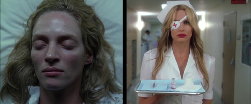 Bevor uns der dritte Zeitsprung unvermittelt in eine Giallo-artige Atmosphäre schmeißt und mit Bernard-Herrmann-Pfeifen, Daryl Hannahs bemaltem weißen Mantel, rotem Regenschirm und im De-Palma-Gedächtnis-Splitscreen präsentierten Dressed to Kill-Krankenschwester-Outfit (samt roter Kreuz-Augenklappe) endgültig den verspielten Tonfall dieser Exploitation-Zentrifuge offenbart. Nur um mit dem Aufwachen der Bride und ihrem markerschütternden Schrei um den Verlust ihres Kindes diesen mit aufrichtiger, heftiger Emotionalität direkt wieder zu brechen.