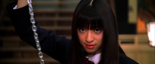 Es folgen vier (!) aufeinanderfolgende Action Set Pieces, die allesamt komplett unterschiedlich sowie absolut atemberaubend sind. Thurman in Bruce Lees Game of Death Jumpsuit und dem Schriftzug Fuck unter ihren Onitsuka Tiger-Sneakern zerlegt erstmal eine kleine Gruppe von O-Rens Leibgarde in einem Chambara-Kurosawa-Samurai-Stil, bei dem langgezogene Momente von Stille in kurze Schwerthiebe und lange Blutfontänen explodieren. Danach folgt Go-Gos großer Auftritt und ein unvergesslicher Kampf, dessen sehr besondere Waffe Erinnerungen an The Flying Guillotine wach werden lässt. Wie die Kette immer lauter und schneller durch die Surround-Lautsprecher des Kinos fetzt, um dann krachend Holz zu zersplittern, klingt auch heute dank des herausragenden Sounddesigns noch maximal spektakulär. Und auch wenn der Versuch, etwas so inhärent Filmisches wie diese Sequenz in Worten zu beschreiben, zwangsläufig scheitern muss: