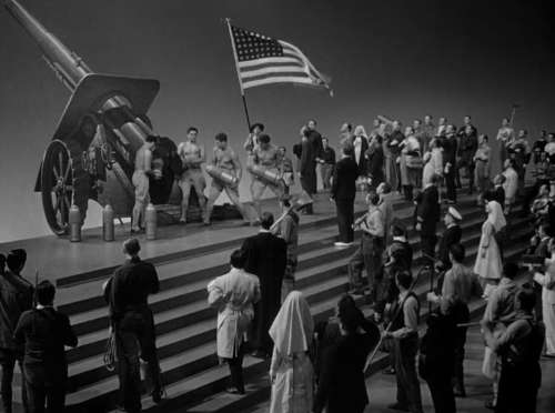 Die Folge war dann auch Cagneys einziger Oscar-Sieg in dessen langer Karriere. Auch angesichts der Energie, mit der sich Cagney als nicht gerade geborener Tänzer in die Musical-Passagen wirft, ist der dann nicht unverdient. Wobei Cagney schauspielerisch jetzt nur bedingt gefordert wird von einem Film, der – genau wie seine Hauptfigur – in erster Linie einfach nur nett unterhalten will. Dass dies in der zweiten Hälfte immer besser gelingt, liegt auch daran, dass die Musiknummern nun deutlich opulenter und interessanter ausfallen. Parallel dazu steigt aber auch der Anteil an US-Flaggen im Bild, denn jetzt packt der Film mit Hymnen wie "Over There" und "You're a Grand Old Flag" die patriotischsten Werke aus Cohans Repertoire aus.